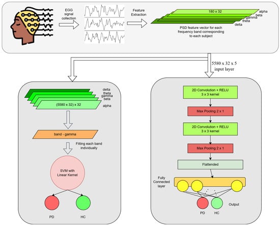 Diagram illustrating the complete pipeline of SVM (left) and our proposed CNN (right) model for PD detection from EEG signals.