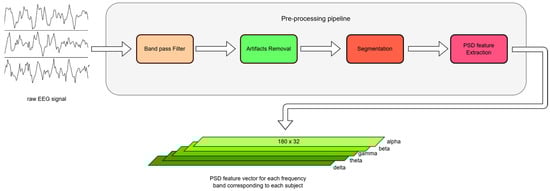 Here, from each 1 s segment, the PSD features are computed across each frequency band (), generating a feature vector where each channel has a set of PSD values for each frequency band, transforming the data shape (180 × 32 for Dataset-1 and 120 × 32 for Dataset-2) to a feature matrix for model input. The whole pre-processing steps are illustrated in Figure 3.