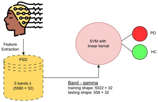 Here, we implement the popular SVM or Support Vector Machine with the linear kernel as a baseline classifier, which gives the binary classification between PD and non-PD patients for all three cases (case 1, case 2, and case 3). In our experiment, all the HCs are labeled as “0”, and PDs are labeled as “1”. We then classify them using different PSD features extracted from each of the bands (as there are five frequency bands, there are five separate input feature vectors, each having a similar shape). Features are extracted for each of the 32 EEG channels [], capturing signal power across different brainwave frequencies.