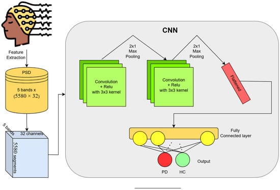 To detect the PD more accurately, we implement a deep CNN model to capture complex patterns inside EEG signals. In the field of deep learning and healthcare, CNN has performed very well, not only with image-type data, but also with various time-series data related to the human body [,,]. In some recent studies [], CNN models have shown effectiveness in automatic PD detection using raw EEG signals. Figure 5 shows the arrangements of our deep convolutional model. We combine the features from all five bands to create a 2D (#bands #channels) input vector for each time sample, allowing the CNN to learn from all frequency bands at once. The expanded shape of the feature map becomes (5580, 32 × 5).