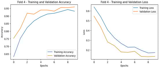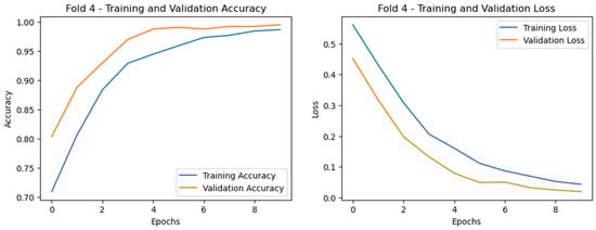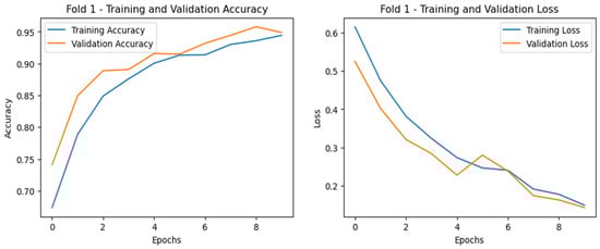 The training and validation curves for all three cases are shown in Figure 10, Figure 11 and Figure 12, respectively, where the accuracy curves are shown in the left part and the loss curves are shown in the right part for the best fold. For case 1 classification inn Dataset-1 (Figure 10), the training accuracy seems to start lower at around 63–65% and increases steadily, reaching ~93–95%, and the validation accuracy starts higher at around 78–80% and increases steadily, stabilizing at ~97%. The steady rise and minimal gap between training and validation accuracy curves imply that no significant overfitting is occurring. The loss curves decrease consistently, with the validation loss being slightly lower, suggesting that the model is not overfitting and is performing well.