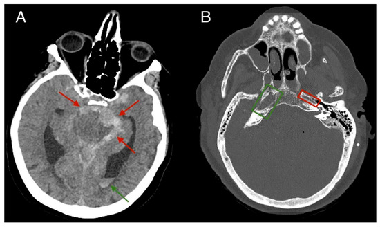 (A) Non-contrast CT scan of the brain, axial plane. The scan shows a large subarachnoid hemorrhage (SAH) around the basal cisterns and the circle of Willis (red arrows). An intraventricular hemorrhage (green arrow) and lateral ventricular enlargement—a sign of obstructive hydrocephalus—were also noted. (B) CT scan of the brain, axial plane, bone window. The patient’s left carotid canal (red rectangle) is narrowed, suggestive of stenosis, measuring approximately 2.7 mm in D, while the right carotid canal (green rectangle) measures within the average range, around 7.5 mm.