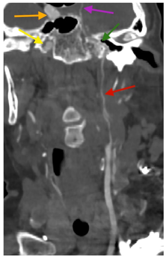 Computed tomography angiography reconstruction, coronal plane. The reconstruction displays a hypoplastic left internal carotid artery along its entire length, including the C1 (cervical part—red arrow), C2 (petrous part—green arrow), and C4 (cavernous part—purple arrow). The normal right internal carotid artery is visible, showing the C2 (petrous part—yellow arrow) and C4 (cavernous part—orange arrow).