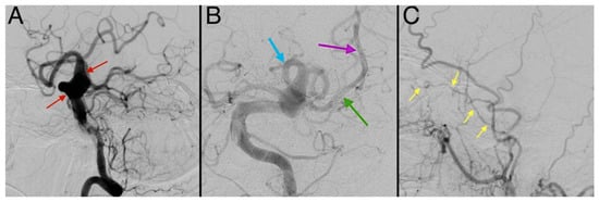 Digital subtraction angiography (DSA) images. (A) An image showing an elongated and ectatic basilar artery with a fusiform aneurysm (red arrows) at its distal end, measuring approximately 10 mm in diameter (⌀). (B) An image demonstrating the middle cerebral artery (M1 sphenoidal segment—green arrow; M2 insular segment—purple arrow) arising through a fetal-type posterior communicating artery (Pcom) (blue arrow). (C) An image displaying a hypoplastic left internal carotid artery terminating in the ophthalmic artery (yellow arrows).