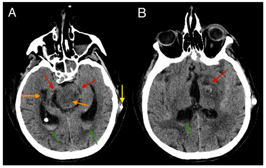 A follow-up CT scan performed 15 days after the initial scan (A,B) indicating a slight resolution of the subarachnoid hemorrhage (red arrows). Partially residual hemorrhagic content is visible in both lateral ventricles (green arrow). A shunt from the external ventricular drainage can also be noted (yellow arrow). Post-ischemic changes at the level of the pons and left basal ganglia can also be observed (orange arrows).