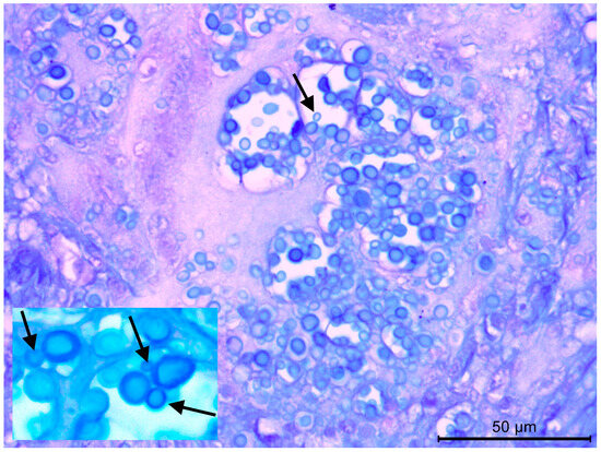 Lung tissue stained with Alcian–HE stain, highlighting numerous yeast-like cells within the cytoplasm of multinucleated giant cells. The yeast forms exhibit narrow-based budding (indicated by arrows), a characteristic feature of certain fungal infections. The organisms are distributed in clusters, with some appearing within vacuolated spaces. The inset provides a higher magnification view, emphasizing the morphology of individual yeast cells and their budding pattern. The background tissue demonstrates an inflammatory response with areas of necrosis.