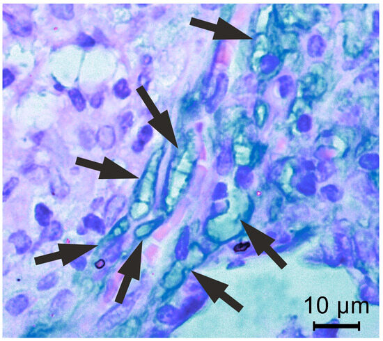 Lung tissue stained with Alcian–HE, highlighting septate fungal hyphae. In very few areas, the fungi appeared as convoluted, elongated hyphae with irregular lumen diameters (indicated by arrows). The surrounding lung tissue demonstrates an inflammatory response, with numerous immune cells infiltrating the area.