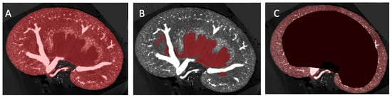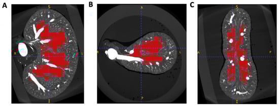 The μCT volumes were processed using ITK-SNAP (version 4.0.1), and the “polygon” function was used to manually isolate 3D anatomical regions of interest [20]. Three regions of interest (ROI) were chosen: ROI A: the entire kidney, ROI B: the pelvic cavity (that may encompass a hydronephrotic cavity, if present), and ROI C: the cortex (defined by the boundary of the arcuate arteries and the kidney capsule) (Figure 1). Masks were created collaboratively by two trained individuals, a medical doctor and a veterinarian. Inter-rater variability was statistically analysed for two test scans, and no significant difference between selected areas included in anatomical masks was seen (Supplementary Data Figure S1). The absolute volume of the kidney and pelvic cavity was collected from ITK-SNAP and used to calculate the percentage of kidney tissue affected by hydronephrosis. Intensity threshold masks to isolate vascular tissue highlighted by the intravascular contrast agent Microfil were created and tailored for each kidney, considering the varying voxel radiopacity range (Supplementary Data Table S1). Vascular threshold masks were visually inspected by a doctor, veterinarian, and kidney physiology specialist for accuracy of vascular selection. Vascular density was calculated as the volume of the vascular threshold mask to the remaining volume of the kidney within anatomical regions of interest. Vascular density was measured in three anatomical regions: the full kidney (Figure 1, ROI A), the renal vascular tissue (ROI A minus ROI B), and the cortex (ROI C). A healthy renal pelvis size (non-hydronephrotic) was considered to be less than 5% of total kidney volume [21].