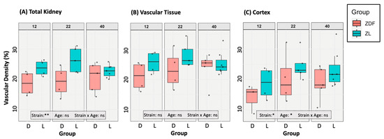 The effects of rat age and strain on the vascular densities within the ROIs were analysed using two-way ANOVAs with Tukey’s HSD post hoc testing. In the analysis of the full kidney region, a significant main effect of rat strain was observed, with ZDF rats (D) showing significantly lower vascular densities than ZL rats (L) across all ages (F(1,23) = 9.99, p = 0.00463 **) (Figure 3A). However, no significant effects of age or the interaction between strain and age were found (age: p = 0.54; strain:age: p = 0.35). No significant pairwise comparisons were detected. When the vascular density of the remaining renal functional tissue was analysed, no significant effects of strain, age, or their interaction were detected (strain: p = 0.063; age: p = 0.52; strain:age: p = 0.68) (Figure 3B). No significant pairwise comparisons were detected. In the cortex region, a significant main effect of strain was found (F(1, 23) = 4.86, p = 0.038 *), indicating lower overall densities in ZDF rats compared to ZL rats (Figure 3C). A significant main effect of age was also detected (F(2, 23) = 3.46, p = 0.049 *). No significant interaction between strain and age was observed (p = 0.92). No significant pairwise comparisons were detected on post-hoc analysis or with t-testing of age-matched groups.