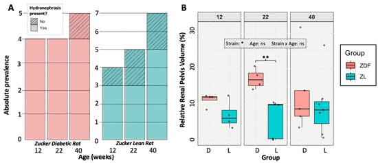 At the point of euthanasia, a hydronephrotic pelvic cavity (exceeding 5% of the total kidney volume) was detected in 92% of ZDF rats and 69% of ZL rats, which is not a significantly different frequency (Fishers; p = 0.183) (Figure 4A). When comparing all rats, the pelvic cavity was, on average, significantly larger in the ZDF rats, at 13.7% of kidney volume, compared to a mean of 7.87% in ZL rats (t-test; p = 0.0308 *). A two-way ANOVA was used to examine the effects and interactions between rat age and strain (ZDF vs. ZL) on relative renal pelvic size in the affected rats. While rat strain had a significant impact on renal pelvic size (F(1,23) = 5.19, p = 0.0324 *), neither age nor any interaction between age and strain had a significant effect (age: p = 0.824; strain:age: p = 0.453). No significant pairwise differences were found on ANOVA post hoc analysis. The only significant difference on t-testing of matched age groups was at 22 weeks (p = 0.00753 **), with higher relative renal pelvis size in the ZDF rat (Figure 4B). Within the population affected by hydronephrosis, there was no significant difference in relative pelvic cavity size due to age, strain, or an interaction between them (strain: p = 0.157; age: p = 0.396; strain:age: p = 0.759). There were also no significant pairwise differences detected.