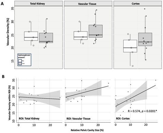 To examine whether vascular density may be affected by the presence of hydronephrosis, we examined the ZL population. One-way ANOVA analysis showed that the age of the ZL rats had no significant impact on vascular density in any of the ROIs investigated: total renal vasculature (p = 0.147), remaining vascular tissue (p = 0.473), or within the cortex (p = 0.296). Thus, we proceeded to analyse the impact of hydronephrosis on the total ZL population, regardless of age. When exploring the effect of hydronephrosis (presence vs. absence) in the ZL group, there were no significant impacts on vascular density in any of the investigated ROIs: total renal vasculature (t-test; p = 0.619), remaining renal vascular tissue (t-test; p = 0.375), or the renal cortex (t-test; p = 0.210) (Figure 5A).