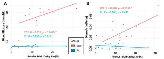 Scatter plot showing the linear relationship between pelvic cavity size and (A) blood glucose and (B) diuresis. Both plots are annotated with separate trend lines for the ZDF and ZL populations, as specified by the key. Correlation statistics for each sub-population are annotated.