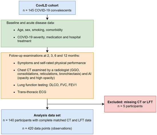 Data of clinical and cardiopulmonary recovery recorded in the prospective multicenter CovILD study is described in more detail in our previous studies on the same cohort [7,8,9,14] (Medical University of Innsbruck, Austria approval number: 1103/2020) and in Supplementary Methods. COVID-19 survivors were recruited between March and June 2020 at three clinical centers in Tyrol, Austria (n = 145), and were investigated at two, three, six, and twelve months after diagnosis. The study inclusion criteria were age ≥ 18 years, SARS-CoV-2 positivity confirmed by PCR and presence of typical COVID-19 symptoms. All participants were infected with the wild-type form of SARS-CoV-2. Herein, n = 420 longitudinal observations from 140 participants were analyzed, with complete CT of the chest and lung function testing (LFT) as analysis inclusion criteria (Figure 1, Supplementary Tables S1 and S2). Please note that per participant, up to four observations were available. Due to this participant-matching, the observations were not independent, which had consequences for our analysis strategy. The dropout rates as compared with the initially recruited n = 145 patients were 17%, 14%, 41%, and 37% at the two-, three-, six-, and twelve-month follow-up (Supplementary Tables S1 and S2).