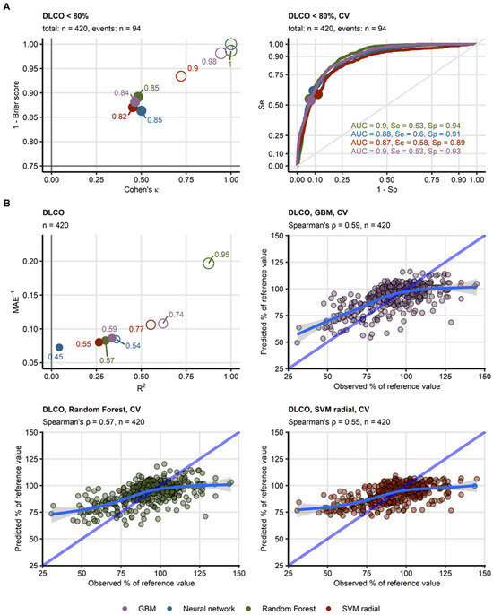 Evaluation of performance of machine learning models of diffusion capacity for carbon monoxide during COVID-19 convalescence. (A) Four machine learning classification models of insufficient diffusion capacity for carbon monoxide (<80% of reference value: n = 94, total observations: n = 420) employing time after COVID-19 diagnosis, computed tomography readouts, demographic and clinical explanatory variables were trained. Their performance was evaluated in the entire data set and 10-repeats 10-fold cross-validation with overall accuracy metric, Cohen’s κ as a measure of concordance between predicted and observed outcome, and Brier score as a measure of model’s calibration. Left: numeric performance measures of the models (open circles: the entire data set, filled circles: cross-validation); point sizes and point labels represent overall model accuracy, the dashed lines visualize values of Cohen’s κ and Brier score expected for prediction of insufficient DLCO be chance. Right: receiver-operating characteristic curves for predictions in cross-validation folds, numeric statistics are displayed in the plot. Numbers of complete observations and observations with DLCO insufficiency (events) are displayed in the plot captions. (B) Four machine learning regression models of diffusion capacity for carbon monoxide (percentage of reference values, total observations: n = 420) employing time after COVID-19 diagnosis, computed tomography readouts, demographic and clinical explanatory variables were trained. Their performance was evaluated in the entire data set and 10-repeats 10-fold cross-validation with R2 as a measure of explained variation, mean absolute error, and ρ Spearman’s coefficient of correlation between the predicted and observed values. Bubble plot: numeric performance measures of the model (open circles: the entire data set, filled circles: cross-validation); point sizes and point labels represent values of ρ correlation coefficient, the dashed line visualizes R2 value expected for a meaningless model. Scatter plots: observed and predicted values of diffusion capacity for carbon monoxide in cross-validation folds; the blue dashed lines with slope 1 and intercept 0 represent absolutely accurate predictions, general additive model trends with standard errors are visualized as the solid blue lines with gray ribbons. Numbers of complete observations and Spearman’s ρ coefficients of correlation between the predicted and observed values are displayed in the plot captions. Ranges of the displayed DLCO values were set to the range of observed DLCO. Abbreviations: DLCO: diffusion capacity for carbon monoxide, CV: cross-validation; AUC: are under the receiver-operating characteristic curve; Se: sensitivity; Sp: specificity; MAE: mean absolute error; GBM: gradient boosted machines; SVM radial: support vector machines with radial kernel.