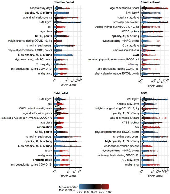 Explanatory variable importance for models of insufficient diffusion capacity for carbon monoxide measured by Shapley additive explanations. Importance of explanatory variables for the machine learning models of insufficient diffusion capacity for carbon monoxide (<80% of reference, Figure 2) was investigated by Shapley additive explanations (SHAP). Absolute SHAP values for explanatory variables with the 15 largest mean SHAP values are presented in violin plots. Points represent single observations, point colors code for minimum/maximum scaled value of the explanatory variable. Explanatory variables obtained via computed tomography are highlighted with bold font in the Y axes. Abbreviations: CT: computed tomography; DLCO: diffusion capacity for carbon monoxide; opacity and high opacity, AI: opacity and high opacity of the lung determined by artificial intelligence; BMI: body mass index; CTSS: human-determined CT severity score, sum for all lobes; ECOG: Eastern Cooperative Oncology Group physical performance score; mMRC: modified Medical Research Council dyspnea scale; ICU: intensive care unit.