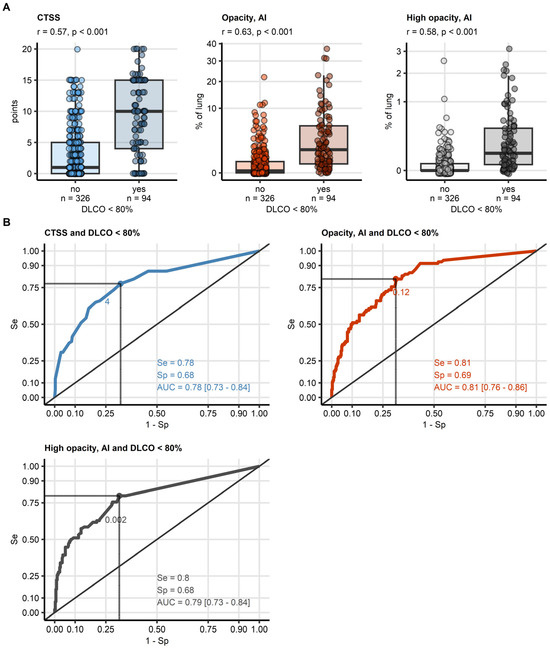 Detection of DLCO insufficiency by human- and artificial intelligence-determined CT readouts of severity of structural lung damage. Human- and artificial intelligence-determined computed tomography readouts of structural lung damage were identified as influential explanatory variables at prediction of insufficiency of diffusion capacity for carbon monoxide (<80%) by machine learning. (A) Values of the radiological readouts of lung damage severity were compared between data points with and without insufficient diffusion capacity for carbon monoxide by blocked bootstrap test with r effect size statistic. Median values with interquartile ranges are depicted as boxes, whiskers span over 150% of the interquartile ranges, single observations are visualized as points. Effect sizes and p values are displayed in the plot captions. Numbers of observations are indicated in the X axes. (B) Quality of detection of insufficient diffusion capacity for carbon monoxide with the radiological readouts of lung damage severity was assessed by receiver-operating characteristic (ROC) analysis. ROC curves are shown, the optimal cutoffs of the severity readouts determined by Youden’s criterion are represented by points with numbers. Sensitivity, specificity at the optimal cutoff, and area under the curve statistic with 95% confidence interval are displayed in the plots. Abbreviations: CT: computed tomography; DLCO: diffusion capacity for carbon monoxide; CTSS: human-determined CT severity score, sum for all lobes; opacity and high opacity, AI: opacity and high opacity of the lung determined by artificial intelligence; AUC: are under the curve of receiver-operating characteristic; Se: sensitivity; Sp: specificity.