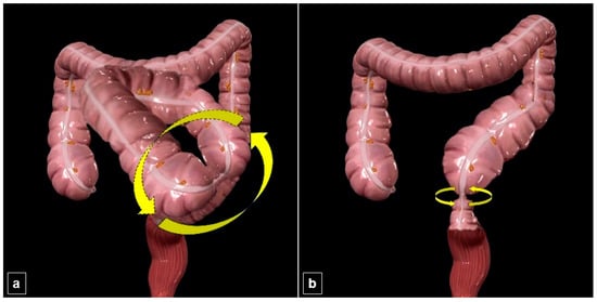 - Rosenblat, J.M.; Rozenblit, A.M.; Wolf, E.L.; DuBrow, R.A.; Den, E.I.; Levsky, J.M. Findings of cecal volvulus at CT. Radiology 2010, 256, 169–175. [Google Scholar] [CrossRef]