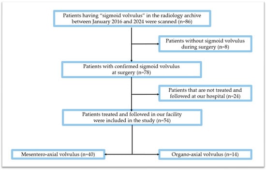 Imaging reports of all contrast-enhanced abdominal CT examinations performed between January 2016 and January 2024 in the Radiology Department of our hospital were scanned using the search term “volvulus”. Out of the patients who were scanned, a total of 86 cases of sigmoid volvulus were found. Our study will include patients with a surgically confirmed sigmoid volvulus who underwent a contrast-enhanced abdominal CT examination at our hospital within 24 h of symptom onset and whose follow-up and treatment occurred at our facility between January 2016 and January 2024. Individuals whose clinical and radiologic findings indicated the presence of an SV but a volvulus was not observed during the operation, as well as individuals whose necessary records could not be accessed due to their ongoing treatment in another healthcare facility were subsequently excluded from the study. Out of 86 patients retrospectively screened, 8 were excluded due to the absence of an SV during surgery, and 24 were excluded because their treatment and follow-up occurred at another hospital, rendering data access impossible. A total of 54 patients were included in this study. Figure 2 illustrates a flow chart depicting the study design.
