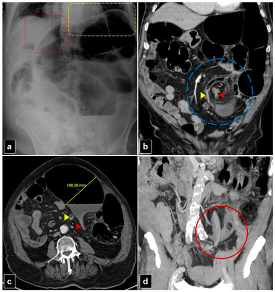 An 80-year-old male patient with a mesentero-axial sigmoid volvulus presented with abdominal pain and constipation for seven days. (a) The plain abdomen radiograph reveals significant distension of the sigmoid loop, characterized by an inverted “U” shape, absence of rectal air lucency, the northern exposure sign, liver overlap sign (red dashed quadrilateral), and the sigmoid apex located beneath the left hemidiaphragm sign (yellow dashed quadrilateral). (b) The coronal plane abdominal computed tomography (CT) image reveals the mesenteric whirlpool sign (blue dashed circle) and transition zones located proximally (yellow arrowhead) and distally (red arrowhead) to the rotating sigmoid loop. (c) The axial plan abdominal CT image shows the degree of distension in the sigmoid colon and the transition zones situated proximally (yellow arrowhead) and distally (red arrowhead) to the rotating sigmoid loop. (d) The coronal plane maximum intensity projection (MIP) CT image of the abdomen shows an x-marks-the-spot sign (red circle) created by the proximal and distal transition zones.