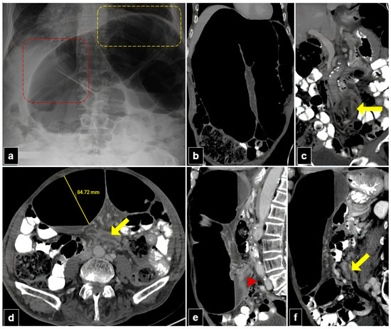 A 77-year-old male patient with organo-axial sigmoid volvulus presented with abdominal pain and distension for two days. (a) The plain abdomen radiograph reveals significant distension of the sigmoid loop, characterized by an inverted “U” shape, liver overlap sign (red dashed quadrilateral), and the sigmoid apex located beneath the left hemidiaphragm sign (yellow dashed quadrilateral). (b,c) Abdominal computed tomography (CT) images in the coronal plane show the inverted U-appearance of the distended sigmoid loop, and only one transition zone is present. Note the split wall sign caused by mesenteric fat tissue at the level of the transitional zone (yellow arrow). (d) The axial plan abdominal CT image shows the degree of distension in the sigmoid colon and the split wall sign located in the transition zone (yellow arrow). (e,f) The sagittal plane CT images of the abdomen show a single transition zone (red arrowhead) and a split wall sign (yellow arrow).