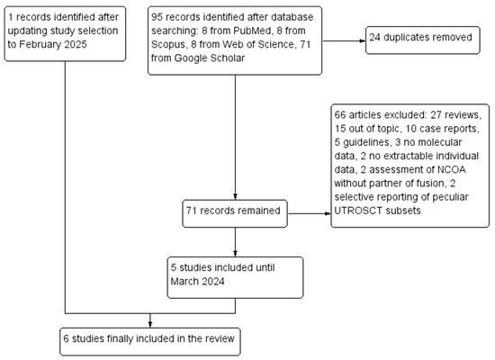 A total of 95 records were retrieved through database searching. After duplicate removal, 72 records remained. Out of these, 66 were excluded: 27 were reviews, 15 were out of topic, 10 were case reports, 5 were guidelines, 3 did not perform molecular analyses, 2 only assessed NCOA genes without partner of fusion, 2 had no extractable individual data, and 2 selectively reported peculiar subsets of UTROSCTs. Five studies [6,7,8,9,10] were included in the review after the first selection; the updated research led to the inclusion of a sixth study [14]. Six studies with 88 molecularly characterized UTROSCTs were finally included in the review. The study selection process is summarized in Figure 1. Characteristics of the included studies are reported in Table 1.