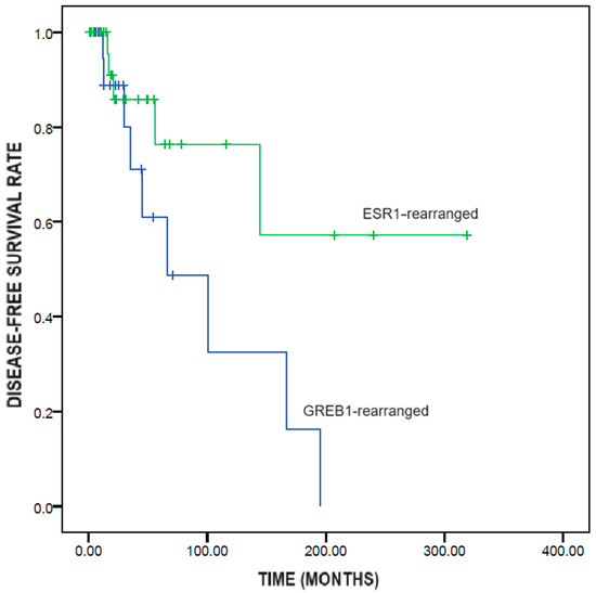 GREB1-rearranged UTROSCTs showed significantly shorter disease-free survival than did ESR1-rearranged UTROSCTs (95.1 ± 22.3 vs. 218.0 ± 39.2 months; p = 0.049) (Figure 2).