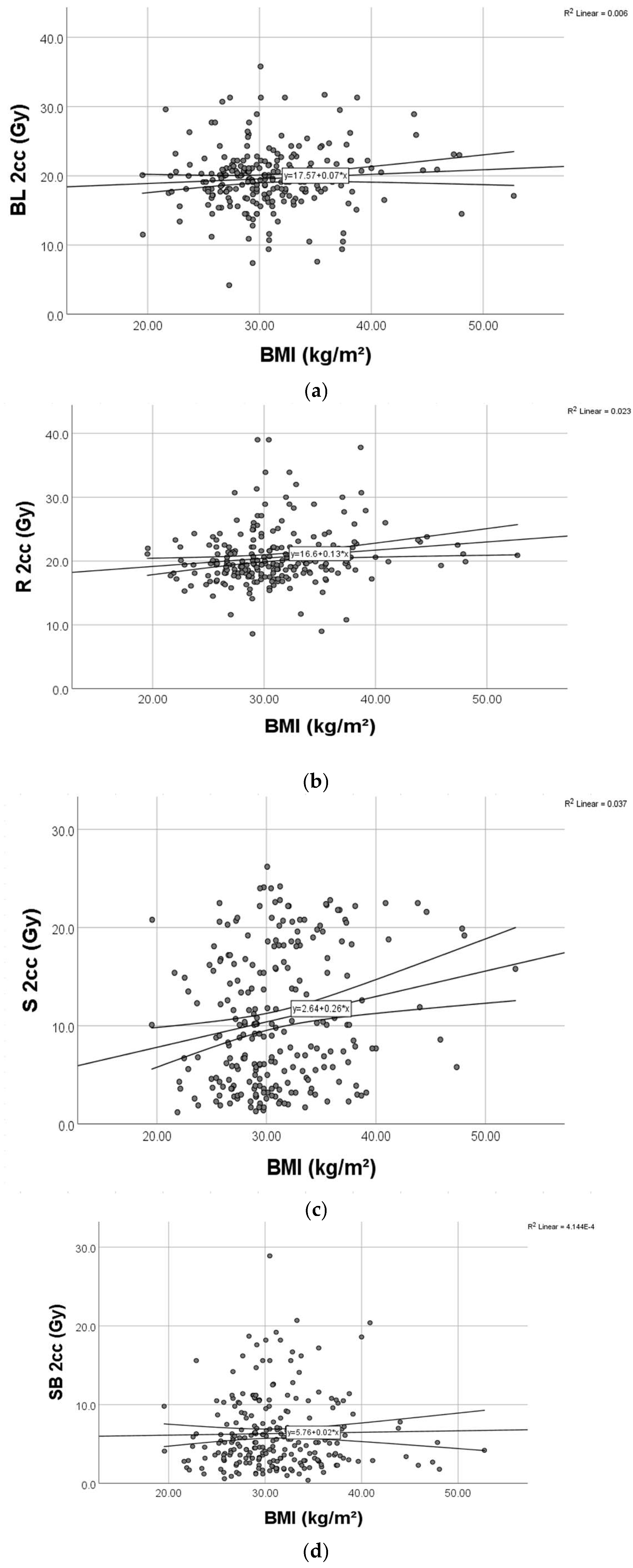 Table 4a–d, BMI remains an independent predictor for rectum and sigmoid doses. The B-value, along with the 95% confidence intervals, can be observed in the respective tables. For each 1 unit increase in BMI, we observed an increase of 0.085 Gy in bladder dose, 0.129 Gy increase in rectum dose, 0.244 Gy increase in sigmoid dose, and 0.02 Gy increase in small bowel dose (
