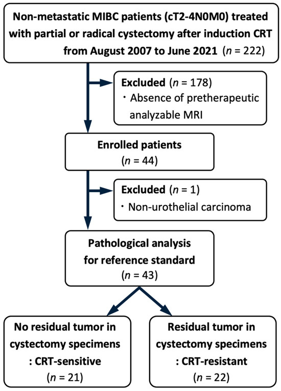 The Institutional Review Board at our center approved this study (M2021-223), and the need for written informed consent was waived owing to the retrospective nature of the study. Of the 222 consecutive patients who underwent partial or radical cystectomy after induction CRT for non-metastatic MIBC (cT2-4N0M0) between August 2007 and June 2021, we selected 44 patients who had undergone MRI examinations using the same protocol before initial TUR. Furthermore, we excluded one patient with non-urothelial carcinoma, resulting in a final analysis cohort of 43 patients. Figure 1 illustrates the patient selection process. The participants were treated based on a previously described therapeutic protocol [17,18]. In summary, patients underwent maximal TUR, defined as the complete endoscopic resection of all visible bladder tumors with no evidence of residual endophytic disease as confirmed cystoscopically, followed by CRT, which included external beam radiotherapy to the small pelvis (40 Gy) and concurrent intravenous cisplatin (20 mg/day for 5 days, administered in two cycles with a 3-week interval). After CRT, considering the initial tumor’s extent and localization within the bladder and the post-CRT status, patients were recommended to receive partial or radical cystectomy with standard pelvic lymph-node dissection for curative intent.