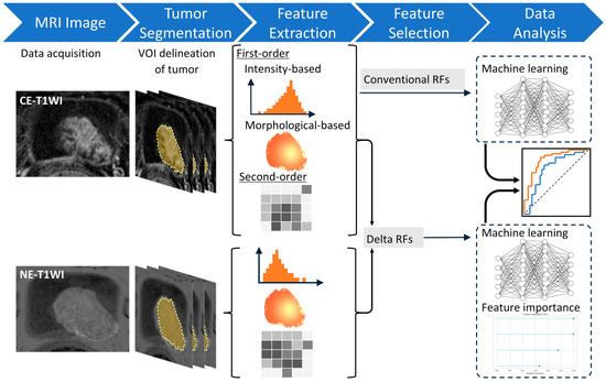 Subsequently, ΔRFs were calculated using the formula: ΔRFs = (RFCE − RFNE)/RFNE, where RFCE and RFNE represent the RFs extracted from CE- and NE-T1WI, respectively. Furthermore, a machine-learning prediction model was developed to predict pCR after CRT, utilizing the ΔRFs as explanatory variables. The predictive performance of this delta-radiomics model was compared with that of a radiomics model based on CE-T1WI alone.