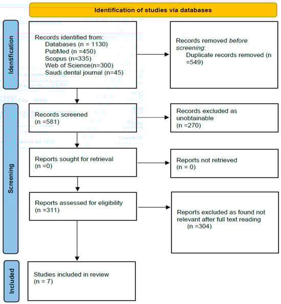 Studies were searched using the following databases: PubMed, Scopus, and Google Scholar. Queries, including the terms “periodontal disease”, “gingivitis”, “periodontitis”, and “risk factors”, and Boolean operators, were used for the search. This review adhered to the PRISMA guidelines. The review hence included 7 papers that passed the inclusion criteria as depicted in the flow diagram of PRISMA (Figure 1).