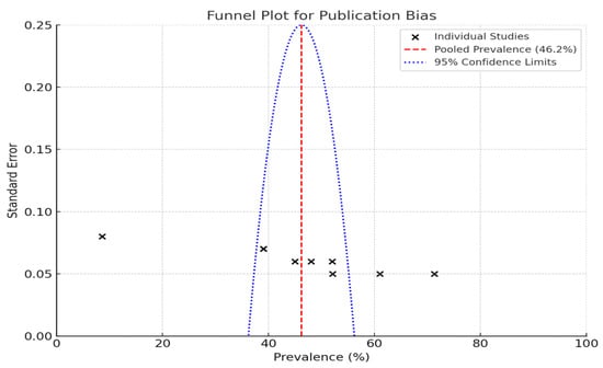The pooled prevalence of periodontal diseases in separate studies is intriguing as shown in Figure 3. The dashed red line indicates a pooled prevalence of 46.2%. This serves as a benchmark for evaluating the findings of individual studies. It is a central place around which one can see that all individual studies are grouped.