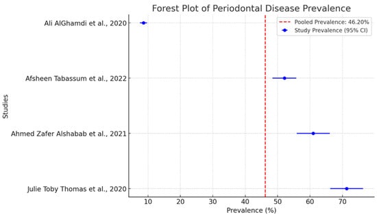 The significant prevalence of periodontal disease in adults with diabetes was 52.1% (95% CI: 45.8–58.4), with substantial heterogeneity (I2 = 80%, p < 0.001). The well-documented relationship between diabetes and periodontal disease has a solid biological basis. Hyperglycemia can destroy periodontal tissue and slow the normal wound-healing response.