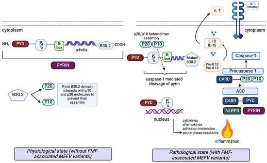 Additionally, the wild-type B30.2 domain of pyrin helps to create a blockade for IL-1β secretion by interacting with proIL-1β. In the presence of FMF-associated MEFV mutations, the mutant B30.2 pyrin domain shows reduced interaction with p20 and p10, thereby allowing p20/p10 heterodimer assembly (active caspase-1), cleavage of pyrin, IL-1β activation and induction of inflammation (left). The N-terminal cleaved fragment of pyrin interacts with IκB-α, p65 and p50 molecules through the bZip domain. Subsequently, it moves into the nucleus to enhance the activation of the NF-κB transcription factor and expression of the proinflammatory genes (bottom).