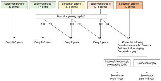 - Spigelman stage 0, I: Repeat EGD every 3–5 years;
