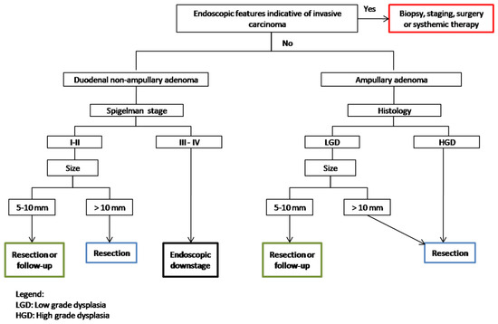 The management of periampullary lesions follows a more complex algorithm. Accurate preoperative diagnosis and staging of ampullary adenomatous lesions are critical for predicting prognosis and determining the most appropriate therapeutic approach. To date, there is no widely accepted classification system for ampullary adenomas. Granular or villiform exophytic lesions are most commonly encountered and associated with a favorable histology. These lesions may present a laterally spreading component, extending onto the duodenal wall beyond the papilla. Smooth elevated lesions are less frequent but are associated with a greater risk for invasive disease [68,69]. Endoscopic features suggestive for invasive carcinoma include ulceration, infiltrative border, and a hard consistency [65,70]; such endoscopic findings should raise the suspicion of invasive carcinoma, discouraging an endoscopic approach for the treatment [58].