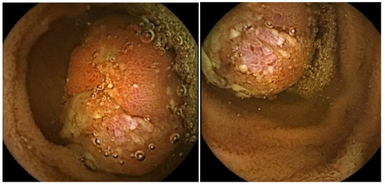 Although surgery is considered a conclusive treatment and the gold-standard treatment for FAP patients with severe polyposis (stage IV), in less advanced cases, depending on the size and number of the polyps, endoscopic resection may be effective in preventing the development of duodenal cancer and in deferring duodenal surgery. Management strategies are evolving, with greater emphasis on personalized therapy. Patients with advanced duodenal polyposis (Spigelman stages III or IV) or advanced papillary lesions should undergo endoscopic downstaging; this practice may reduce the risk of progression to cancer, even though the risk of re-progressing to stage IV within 1 year is reported in 50% of cases [53,54,58]. Clinical practice and cohort studies suggest that duodenal non-ampullary polyps >10 mm should be removed (Figure 3), as lesions <10 mm rarely contain HGD or invasive carcinoma [53,58].