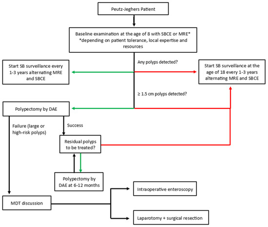 - Wagner, A.; Aretz, S.; Auranen, A.; Bruno, M.J.; Cavestro, G.M.; Crosbie, E.J.; Goverde, A.; Jelsig, A.M.; Latchford, A.R.; van Leerdam, M.E.; et al. The Management of Peutz–Jeghers Syndrome: European Hereditary Tumour Group (EHTG) Guideline. J. Clin. Med. 2021, 10, 473. [Google Scholar] [CrossRef] [PubMed]