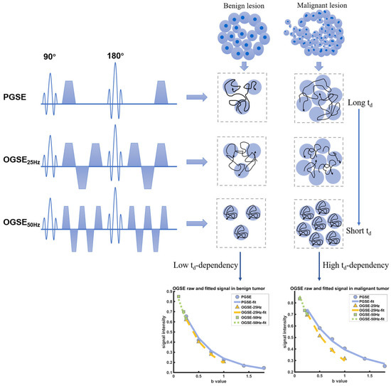 Several studies have suggested that the oscillating gradient spin-echo (OGSE) sequence is accessible for microstructural detection [16,17,18]. The oscillatory gradient spin-echo acquisition improves detection sensitivity by shortening the effective diffusion time, and detects the time-dependence of the apparent diffusion coefficient (ADC) through a mixture of long and short diffusion times [17]. Therefore, OGSE sequences may detect the microscopic internal structure of pathological lesions by analyzing the diffusion rate changes of different diffusion times, which overcomes the shortcomings of conventional PGSE sequences [19].