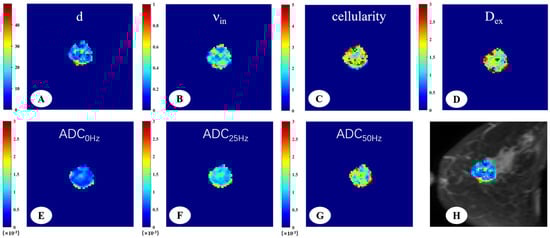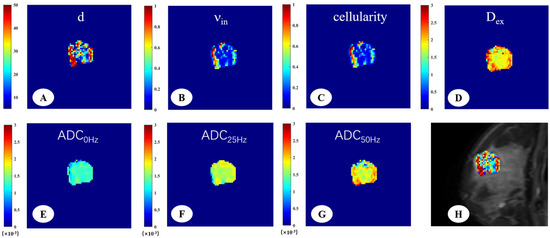 Figure 2. A 66-year-old woman with invasive ductal carcinoma in the left breast. The IMPULSED-derived maps showed mean cell size d = 16.47 μm (A), intracellular volume fraction νin = 0.41 (B), cellularity = 2.86 (C), and extracellular diffusion coefficient Dex = 1.82 μm2/ms (D). The ADC map derived from PGSE (E), OGSE25Hz (F), and OGSE50Hz (G) showed the ADC values in different sequences, ADC0Hz = 0.72 × 10−3 mm2/s, ADC25Hz = 1.18 × 10−3 mm2/s, ADC50Hz = 1.65 × 10−3 mm2/s. IMPULSED-derived maps of mean cell size d overlaid on the corresponding diffusion-weighted image (H).