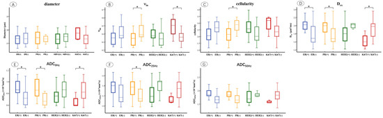 Figure 4. Box and whisker plots show the comparisons of microstructural parameters between different ER, PR, HER2, and Ki67 groups, including mean diameters (A), νin (B), cellularity (C), Dex (D), ADC0Hz (E), ADC25Hz (F), ADC50Hz (G). p < 0.05 was denoted in the plots using *. Whiskers denote the range in each group, dots represent individual data points, boxes indicate the SD, and midlines are the median.