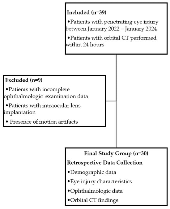 This study included patients diagnosed with penetrating ocular injury via ophthalmological examination between January 2022 and January 2024 who had available orbital CT images obtained within 24 h. Ethical approval was obtained for this study (2024-KAEK-31). Due to the retrospective design of this study, additional informed consent was not required outside of the routine general information and consent form obtained before imaging methods and the consent form obtained before the repair of open globe injuries. This study adhered to the principles of the Helsinki Declaration. Patients with rupture, perforating injury, or intraocular foreign body, those with incomplete data in ophthalmologic examination records, those with previous intraocular lens implantation, and those with orbit CT images unsuitable for evaluation due to motion artifacts were excluded from this study (See Figure 1 for the study design flowchart).