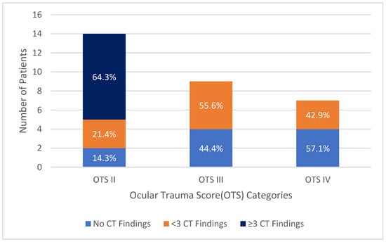 Penetrating globe injuries present challenges such as providing patient counseling and informing about visual prognosis. Studies in the literature have shown that OTS supports ophthalmologists in determining surgical timing after OGI, assessing the need for early vitreoretinal surgery, defining the surgical scope, managing secondary complications and secondary surgical requirements, and predicting visual acuity outcomes [26,27,28,29,30,31]. In our study, the negative correlation between the number of CT findings and OTS, as well as the presence of certain CT findings (decreased globe volume, lens dislocation, and abnormal vitreous density) and the fact that all patients with ≥3 CT findings were classified in OTS category II, suggest that the evaluation of CT findings may also play a role in this critical process. Similarly, Ameli et al. reported that abnormal vitreous density, chorioretinal thickening, and the presence of intraocular foreign body/air were associated with more advanced OTS stages (I-II). They also reported lower OTS and more advanced OTS categories in eyes with more CT findings [16]. The association of certain CT-detected findings with more advanced OTS categories in our study and similar studies may be related to the fact that these pathologies contribute to lower initial visual acuity. Arey et al. found significantly higher positive radiographic findings on CT in eyes with occult OGI compared to intact eyes [8]. Additionally, another study reported that patients with poor visual outcomes (<2/200) or those who underwent enucleation demonstrated significantly more CT abnormalities compared to patients with good visual outcomes [7]. Our results and those in the literature suggest that detecting multiple positive CT findings in trauma patients with OGI should be noteworthy to ophthalmologists. Particularly in cases where initial visual assessment cannot be performed due to conditions such as loss of consciousness, CT may help in managing post-traumatic uncertainty.