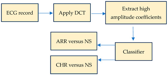 Electrocardiography is a popular noninvasive technique for monitoring human heart electrical activity with various biomedical engineering applications, including ECG complexity analysis [18,19,20,21,22,23,24,25,26], pathology detection [1,2,3,4,5,6,7,8,9,10,27] and signal denoising [28]. In this study, three statistical classifiers are employed to classify normal and pathological ECG signals when the DCT is applied to extract a features vector consisting of the lower half of the obtained coefficients. Those high amplitude coefficients are used to characterize the original ECG signal patterns and kNN, NB, and nonlinear SVM classifiers are trained with them for ECG signal classification following two different scenarios: cardiac arrhythmia versus normal sinus rhythm, and congestive heart failure against normal sinus rhythm.