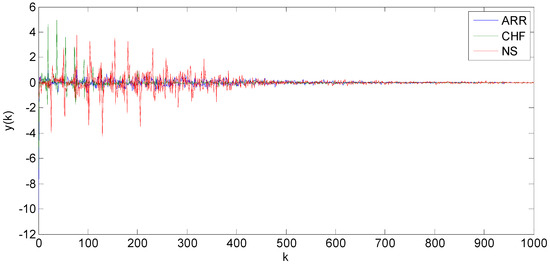 Plots of DCT coefficients y(k) for k = 1 to 1000. ARR, CHF, and NS are respectively cardiac arrhythmia (ARR), congestive heart failure (CHF), and normal sinus rhythm (NS).