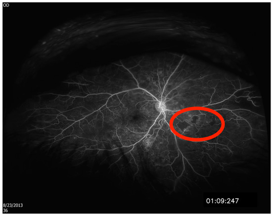 An example of a manually delineated area of retinal nonperfusion used to determine the area of nonperfusion by the freehand method. Red circle demonstrates areas of nonperfusion (black) adjacent to blood vessels.