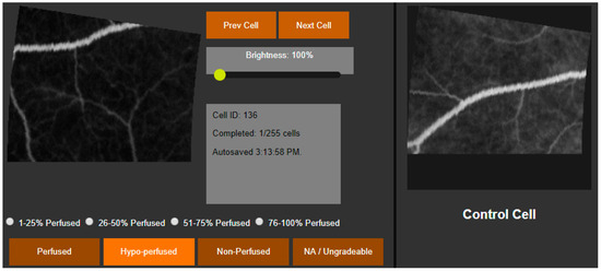 The grader marks each image segment as perfused, one of 4 levels of hypo-perfused, nonperfused, or ungradable by direct comparison to a control cell. The brightness slider adjusts the brightness of the assessment cell and the control cell simultaneously to help visualize image features while maintaining an accurate comparison.