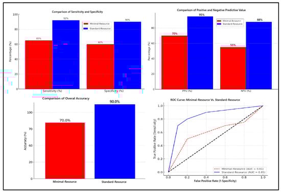 Figure 1 compares the diagnostic accuracy of minimal-resource and standard-resource radiographic interpretations based on sensitivity, specificity, PPV, NPV, overall accuracy, and ROC curve analysis. Minimal-resource imaging demonstrated 65% sensitivity and 60% specificity, which was significantly lower than the standard-resource imaging, which achieved 92% and 90%, respectively. The PPV and NPV for minimal-resource imaging were 70% and 55%, whereas they reached 95% and 88% for standard-resource imaging, indicating a higher diagnostic error rate for minimal-resource imaging. The accuracy for minimal-resource imaging was only 63%, compared to 91% for standard-resource imaging. Minimal-resource interpretations had lower sensitivity, specificity, and interobserver agreement (κ) than standard-resource interpretations. False positives and false negatives were more frequent in minimal-resource settings.