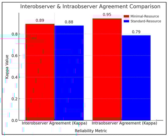 Figure 2 compares the reliability of radiographic interpretation between minimal-resource and standard-resource methods based on interobserver and intraobserver agreement using the kappa coefficient (κ). The interobserver agreement showed that minimal-resource imaging had a κ value of 0.89, while standard-resource imaging had a κ of 0.88, indicating near-perfect agreement and high consistency among the examiners. Repeated radiation exposure was minimized through protocol adherence, ensuring that standard-resource evaluations were conducted independently (blinded to previous minimal-resource interpretations).