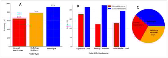 Factors affecting diagnostic accuracy for minimal-resource and standard-resource radiographic interpretations: (A) accuracy based on reader experience; (B) comparison of minimal-resource vs. standard-resource accuracy; (C) proportion of accuracy based on reader experience.