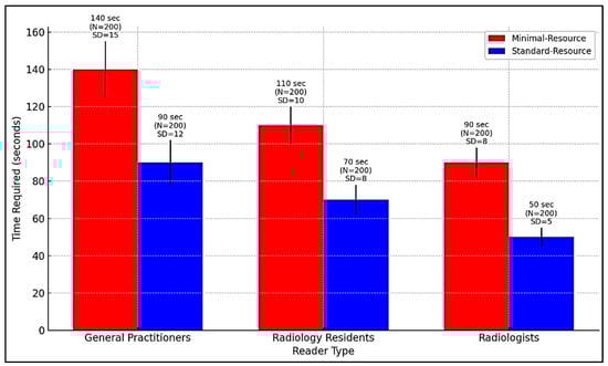 Figure 4 compares the time required for radiographic interpretation among general practitioners, radiology residents, and radiologists under minimal-resource and standard-resource conditions. Due to limited training and lower image quality, general practitioners require the longest interpretation time, especially with minimal-resource imaging. AI integration can support workflow optimization by reducing interpretation time, prioritizing high-risk cases, and assisting non-specialists in identifying fractures more accurately.